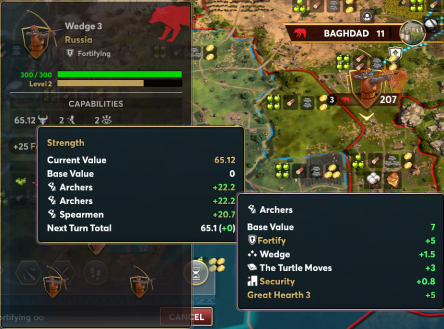 6. Finally, Baghdad is a capital which has a Great Heath improvement on it. This provides +5 strength to all units defending.